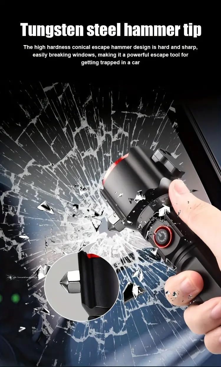 فيه أداة كسر زجاج — مهم جدًا للسيارة والسفر والمواقف الخطيرة.